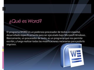 Word es un poderoso procesador de texto desarrollado para Microsoft Windows. Permite escribir y editar documentos, aplicar formatos de texto, insertar imágenes, crear tablas y columnas, y combinar correspondencia. Sus características incluyen opciones de formato, corrección ortográfica, y soporte multilenguaje.