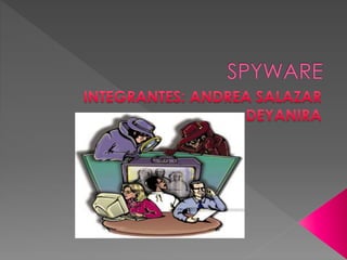 El documento proporciona información sobre spyware. Explica que el término spyware se utilizó por primera vez en 1994 en una publicación en broma sobre el modelo de negocio de Microsoft y desde entonces ha sido usado para referirse a software que recopila información de un ordenador sin el consentimiento del usuario. Describe que el spyware puede instalarse a través de otros programas e indica algunas señales de que un equipo puede estar infectado como nuevas barras de herramientas no deseadas o un rendimiento más lento. Recomienda usar programas antispy