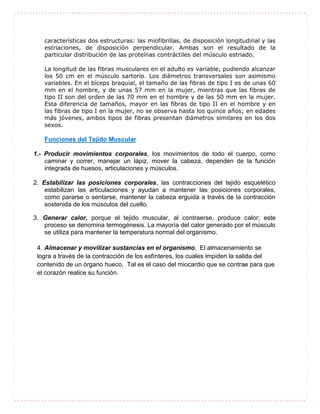 Este documento describe las características del tejido muscular. Explica que el tejido muscular se origina principalmente en el mesodermo durante el desarrollo embrionario y está compuesto de células llamadas miocitos. Describe las tres categorías principales de tejido muscular - esquelético, cardíaco y liso - y proporciona detalles sobre la estructura y función del músculo estriado. Finalmente, enumera cuatro funciones clave del tejido muscular: producir movimiento, estabilizar posiciones corporales, generar calor