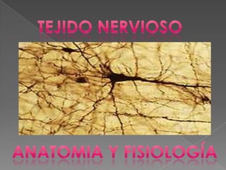 El tejido nervioso se origina principalmente desde el ectodermo y está compuesto por neuronas y células de neuroglia. Las neuronas se comunican formando redes que reciben información sensorial, la procesan y generan señales hacia células efectoras, mientras que las células de neuroglia como astrocitos y oligodendrocitos brindan soporte y nutrición a las neuronas. El edema cerebral es la acumulación anormal de agua en los tejidos del sistema nervioso central y puede ser vasogénico, citotóxico o interst