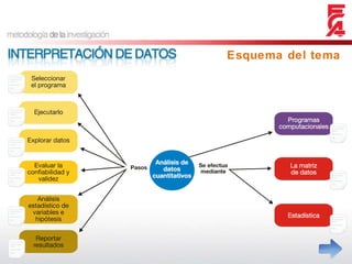 Este documento presenta una introducción general a los conceptos y métodos estadísticos, incluyendo programas estadísticos como SPSS y Minitab, la matriz de datos, estadística descriptiva, medidas de tendencia central y variabilidad, estadística inferencial, pruebas paramétricas y no paramétricas, y los pasos para preparar un informe de resultados estadísticos.