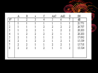El documento describe el método de diseño de experimentos de Taguchi. Este método busca obtener una combinación óptima de parámetros de diseño para que un producto sea funcional y robusto ante factores de ruido. Consiste en tres etapas: diseño del sistema, diseño de parámetros y diseño de tolerancias. La etapa más importante es el diseño de parámetros cuyo objetivo es identificar factores que afectan la calidad y definir sus niveles óptimos para optimizar el producto.