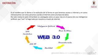 La Web 3.0 se refiere a la evolución de Internet hacia una red semántica e inteligente, donde los datos estructurados y los metadatos permitirán una mayor personalización y accesibilidad de la información. Algunas características clave incluyen el uso de bases de datos semánticas, agentes inteligentes, buscadores semánticos y entornos 3D avanzados. El objetivo es almacenar preferencias de usuarios para proporcionar contenidos más precisos y fidelizar a las marcas.