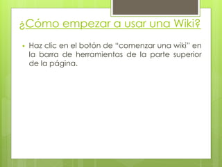 Este documento proporciona instrucciones sobre cómo crear y configurar una wiki. Explica los pasos iniciales como hacer clic en "comenzar una wiki", elegir un nombre, URL y categoría. También describe cómo las páginas son editables por cualquier persona y cómo incluir contenido como videos, imágenes y archivos. Finalmente, da instrucciones específicas sobre cómo crear y dar formato a las páginas de la wiki recién creada.