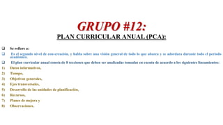 El Plan Curricular Anual (PCA) es el segundo nivel de concreción y proporciona una visión general de todo el contenido y actividades que se abordarán durante el año escolar. Consta de 8 secciones que deben analizarse y tomarse en cuenta, incluyendo datos informativos, tiempo, objetivos generales, ejes transversales, desarrollo de unidades de planificación, recursos, planes de mejora y observaciones.