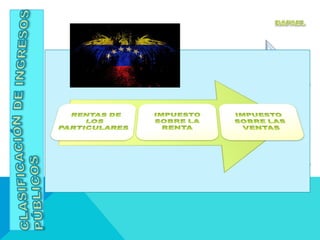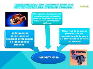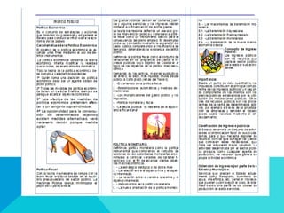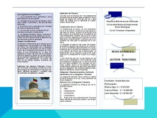 El documento presenta información sobre impuestos y la política económica en Venezuela. Explica que los impuestos son obligaciones dinerarias impuestas por el Estado para financiar el gasto público. Distingue entre impuestos directos e indirectos. También describe el sistema tributario venezolano y las instituciones involucradas como el Servicio Nacional Integrado de Administración Aduanera y Tributaria.