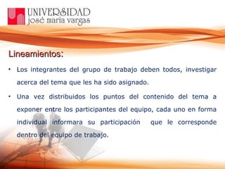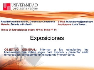 Este documento proporciona lineamientos para que estudiantes presenten exposiciones en grupos sobre temas de ética profesional. Cada estudiante debe investigar su tema asignado y publicar su contenido individual en un sitio como Slideshare o blog, enviando el enlace al profesor. Luego, un representante del grupo publicará la exposición completa en uno de esos sitios y enviará el enlace al profesor. Se incluyen enlaces de apoyo para crear blogs o usar herramientas de presentación.
