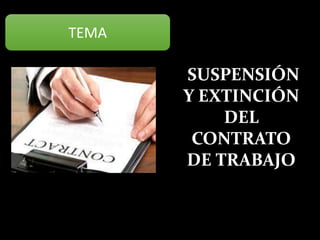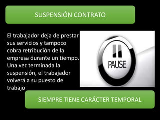 El documento describe los tipos de suspensión y extinción del contrato de trabajo. En cuanto a la suspensión, señala que es temporal y siempre con carácter temporal, mencionando doce tipos diferentes como la maternidad, enfermedad, excedencia, fuerza mayor, entre otros. En cuanto a la extinción, indica que es definitiva y puede darse por voluntad del trabajador, de la empresa u otras causas, detallando los procedimientos y posibles consecuencias de cada caso.