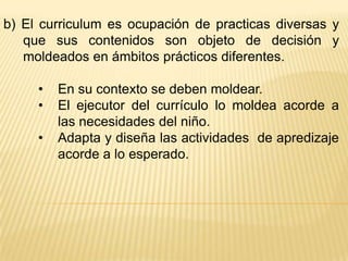 El documento describe las características de un currículo efectivo desde la perspectiva de diseño. Debe atender a las necesidades de los estudiantes, considerar su nivel de desarrollo cognitivo y responder al contexto social. El currículo debe moldearse a las necesidades locales y ser adaptado por los maestros. Para comprender el currículo desde la perspectiva de los estudiantes, es importante entender tanto sus objetivos manifiestos como sus dimensiones ocultas.