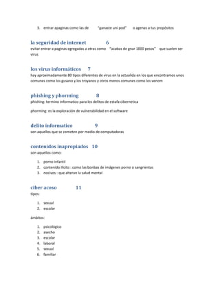 El documento resume varios temas relacionados con la seguridad en Internet. Explica conceptos como protocolos de comunicación como HTTP y TCP/IP, tipos de virus informáticos como gusanos y spyware, y formas de protegerse como usar firewalls y antivirus actualizados. También describe delitos cibernéticos como phishing y contenidos inapropiados, así como formas de cuidar la privacidad en Internet como no realizar transacciones en sitios web no seguros.