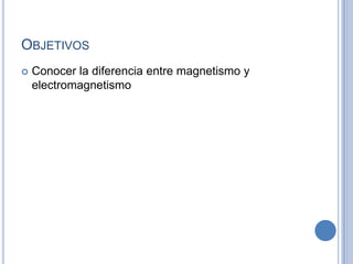 Este documento explica la diferencia entre magnetismo y electromagnetismo. Define un imán como un material capaz de producir un campo magnético exterior y atraer el hierro, ya sea de forma natural como la magnetita o artificial a partir de aleaciones metálicas. Describe que en la materia existen pequeños imanes o dipolos debidos al movimiento de electrones, y que cuando están alineados actúan como un único imán magnetizando el material.