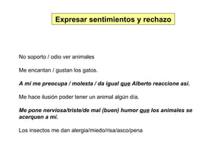 El documento habla sobre cómo expresar sentimientos y rechazo utilizando verbos como gustar, molestar, preocupar y dar igual, así como expresiones como "me hace ilusión" y "me ponen nervioso". También explica que estos verbos y expresiones se pueden usar con sustantivos, infinitivos o la conjunción "que" seguida de subjuntivo, dependiendo de si el sujeto es el mismo o diferente entre la oración principal y subordinada. Además, menciona algunos verbos comunes para expresar sentimientos, deseos y voluntad