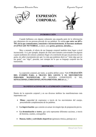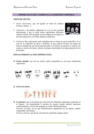Este documento habla sobre la expresión corporal y cómo el cuerpo puede comunicar emociones, pensamientos e ideas de manera consciente o inconsciente a través del lenguaje no verbal como gestos, posturas y miradas. Define la expresión corporal como la utilización del cuerpo para manifestar sensaciones y emociones a través del gesto y el movimiento. Explica algunas de las manifestaciones más importantes de la expresión corporal como el mimo, la improvisación, la dramatización y los bailes, y las zonas expresivas más importantes como la cara, las man