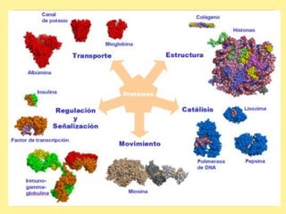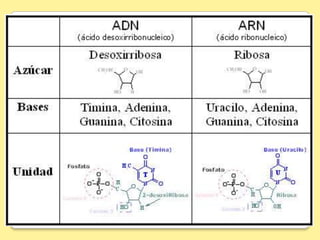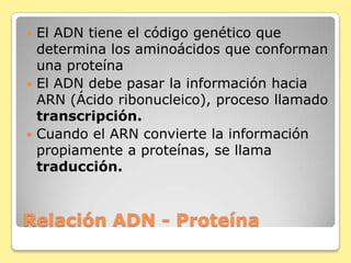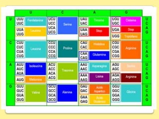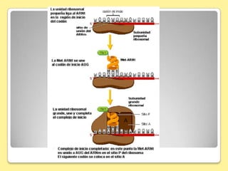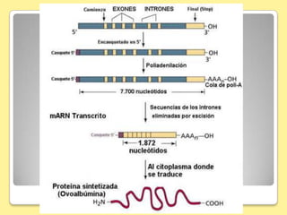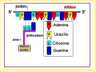 El documento describe el proceso de expresión génica desde la transcripción del ADN al ARNm hasta la traducción del ARNm en proteínas. La transcripción convierte la información del ADN en ARNm en el núcleo. Luego, el ARNm es transportado al citoplasma donde ocurre la traducción en los ribosomas, usando ARNt, para sintetizar proteínas siguiendo el código genético. El proceso completo permite que la información en el ADN se exprese como proteínas funcionales.