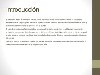 El documento aborda el arte como medio de expresión cultural y social a lo largo de la historia humana, destacando su evolución desde la antigüedad hasta la contemporaneidad. Se exploran diversas disciplinas artísticas y su importancia en la comunicación y la transmisión de valores, así como la relación entre el arte y la psicología. Concluye que el arte es una manifestación cultural rica y multifacética que refleja la realidad social y histórica de las sociedades.