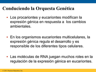 Este documento describe los mecanismos de regulación de la expresión génica en organismos eucariotas. La expresión génica está regulada a través de modificaciones en la cromatina, procesamiento del RNA, iniciación de la traducción y procesamiento de proteínas. Factores como la acetilación de histonas, metilación del DNA y procesamiento alternativo del RNA influyen en la expresión de genes específicos en diferentes tipos celulares.