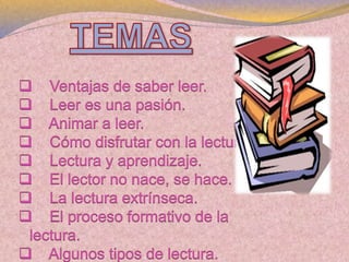 El documento describe los numerosos beneficios de la lectura, incluyendo mejorar el rendimiento intelectual y académico, hacer a las personas más críticas, tolerantes y reflexivas, mejorar la ortografía, reducir el estrés, fomentar el espíritu de investigación y la toma de decisiones, adquirir conocimiento, perfeccionar el lenguaje, mejorar la imaginación y la creatividad, y ampliar la red de contactos. Además, discute diferentes tipos de lectura como la mecánica, fonológica