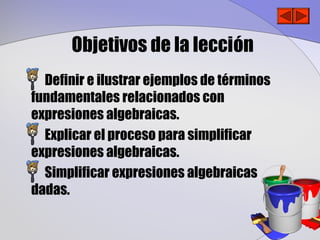 Este documento define expresiones algebraicas y proporciona ejemplos. Explica que una expresión algebraica relaciona valores indeterminados con constantes y operaciones. Describe cómo clasificar expresiones como racionales, irracionales, enteras o fraccionarias. Además, define términos como términos semejantes y coeficientes numéricos. Finalmente, explica cómo simplificar expresiones algebraicas mediante la suma de términos semejantes.