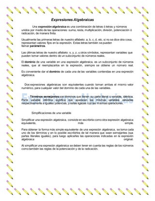 Este documento presenta información sobre expresiones algebraicas, incluyendo: (1) la definición de una expresión algebraica y sus componentes como variables, letras y operaciones; (2) las reglas para simplificar, sumar, restar, multiplicar y dividir expresiones algebraicas; y (3) conceptos como polinomios, factorización, y el cálculo del valor numérico de una expresión. El documento proporciona ejemplos para ilustrar cada uno de estos conceptos y técnicas algebraicas.