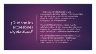 Este documento explica las expresiones algebraicas, incluyendo su definición, clasificación, sumas, restas, multiplicaciones, divisiones, valor numérico, y factorización. Define una expresión algebraica como una combinación de letras y números unidos por operaciones matemáticas. Explica que las letras representan valores fijos o variables, y clasifica expresiones en monomios, binomios, trinomios y polinomios.