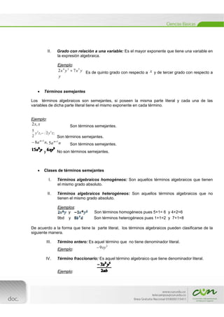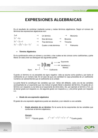 Este documento describe los conceptos básicos de las expresiones algebraicas, incluyendo términos algebraicos, monomios, polinomios, grado de una expresión, términos semejantes y clases de expresiones algebraicas como binomios, trinomios y polinomios. Explica cómo combinar términos semejantes mediante suma y resta, y cómo clasificar expresiones según su forma y grado.