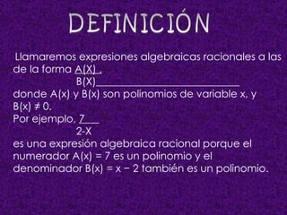 El documento explica las expresiones algebraicas racionales, que son fracciones donde el numerador y denominador son polinomios. Detalla cómo simplificar estas expresiones factorizando y cancelando términos iguales en el numerador y denominador. También describe cómo realizar operaciones como suma, resta, multiplicación y división con expresiones algebraicas, aplicando las mismas propiedades de las fracciones numéricas. Finalmente, presenta ejemplos de cómo resolver operaciones combinadas con expresiones algebraicas racionales.