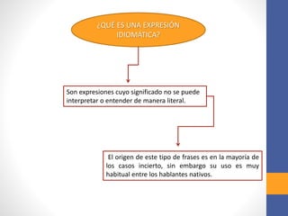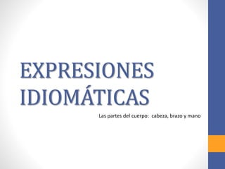 El documento aborda las expresiones idiomáticas relacionadas con partes del cuerpo como cabeza, brazo y mano, explicando que su significado no es literal y su origen es generalmente incierto. Incluye ejemplos y ejercicios prácticos para que los estudiantes aprendan y utilicen estas expresiones en conversaciones. Se propone una actividad interactiva que involucra práctica en línea y trabajo en parejas.