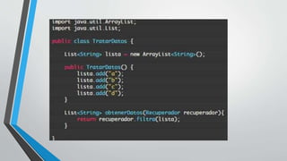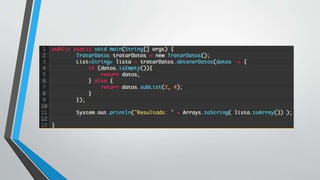 Las expresiones lambda permiten crear código más conciso y significativo al referenciar métodos anónimos sin nombre. Una expresión lambda se compone de una lista de parámetros, el símbolo de flecha "->" y un cuerpo de código o expresión. También existe una forma abreviada llamada referencia a método para llamar métodos de objetos.