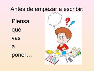 El documento ofrece consejos para escribir bien, indicando que toda historia debe tener una presentación, una parte principal y un final. Además, recomienda usar frases cortas, signos de puntuación, unir frases con palabras de enlace y consultar el diccionario cuando no se sepa cómo escribir una palabra.