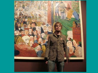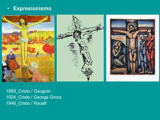 El documento describe el expresionismo y sus antecedentes. El expresionismo surgió a finales del siglo XIX y principios del XX como una reacción al impresionismo, enfocándose en la expresión subjetiva más que en impresiones. Artistas expresionistas clave incluyen a James Ensor y Edward Munch, quienes usaron la distorsión para expresar temas como ansiedad, celos y muerte.