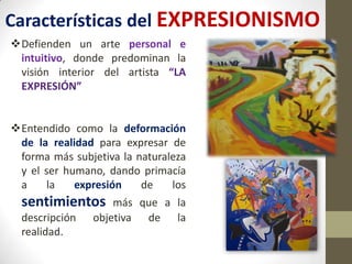El expresionismo surgió en Alemania a principios del siglo XX como una reacción al impresionismo y naturalismo, plasmando la visión subjetiva e intuitiva del artista sobre la realidad a través de la deformación de formas y el uso de colores vibrantes. Se caracterizó por dar primacía a la expresión de sentimientos sobre la descripción objetiva. Sus principales referentes fueron el noruego Edvard Munch, conocido por sus pinturas trágicas con colores violentos, y el belga James Ensor, pionero del estilo por su visión gro