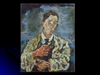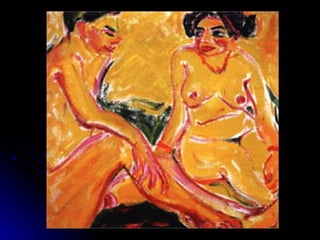 El documento resume el movimiento artístico del expresionismo que surgió en Alemania en 1909. Algunos de los artistas más destacados fueron Kirchner, Munch, Heckel, Nolde y Picasso. Obras emblemáticas incluyen "El Grito" de Munch y pinturas de calles de Berlín. El expresionismo se caracterizó por expresar emociones internas en lugar de aspectos externos a través de colores intensos y formas distorsionadas. Más tarde, el movimiento se consolidó en dos grupos alemanes, Der Blaue