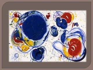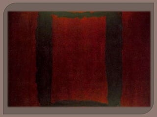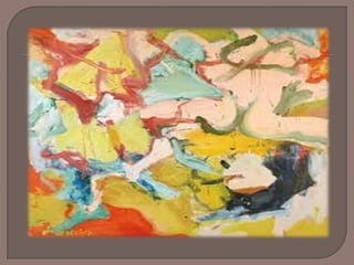 El expresionismo abstracto surgió en Estados Unidos en los años 40 como un movimiento pictórico posterior a la Segunda Guerra Mundial. Se caracterizó por el uso de grandes formatos y la eliminación de la figuración a favor de trazos espontáneos e informales. Artistas clave como Pollock, Rothko, De Kooning y Motherwell promovieron una pintura de acción que buscaba expresar emociones y el inconsciente a través de la libre ejecución del acto de pintar.