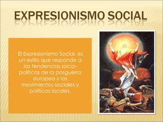 El Expresionismo Social surgió en Europa después de la Primera Guerra Mundial como respuesta a las tendencias socio-políticas y los movimientos sociales. Pretendía expresar las emociones interiores a través de la deformación y exageración de formas y colores. Agrupó a artistas de variadas tendencias que defendían un arte más intuitivo y personal centrado en la visión interior del artista. Magnificaba el dolor y la explotación social a través de imágenes deformadas y colores oscuros.