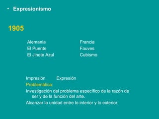 El documento describe el desarrollo del expresionismo y el arte abstracto en Alemania e influencias como el fauvismo francés y el cubismo. Se menciona el grupo Die Brücke y su interés en la naturaleza, la Edad Media y lo primitivo, así como Der Blaue Reiter y sus esfuerzos por lograr la unidad entre lo interior y exterior a través del arte. También analiza las teorías de Wassily Kandinsky sobre la abstracción lírica y el sinestesia entre la música y las artes visuales.