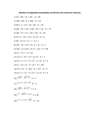 El documento presenta una serie de 17 expresiones numéricas con números enteros y naturales que deben resolverse. Luego, presenta 20 expresiones numéricas similares pero con números racionales que también deben calcularse. El objetivo es evaluar cada expresión y encontrar el valor numérico resultante (R).