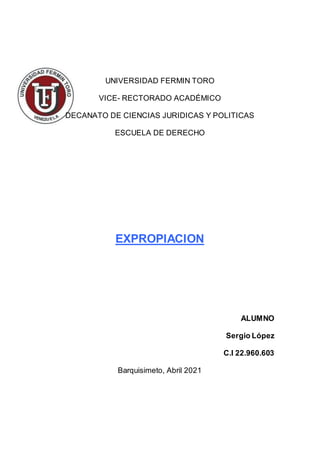La expropiación es el proceso mediante el cual el Estado priva a una persona de un bien a cambio de una indemnización, cuando dicho bien es necesario para un proyecto de utilidad pública o interés social. El procedimiento de expropiación incluye las fases legislativa, ejecutiva y judicial. En la fase legislativa, la Asamblea Nacional declara el carácter de utilidad pública del proyecto. En la fase ejecutiva, el Ejecutivo Nacional emite un decreto expropiatorio y trata de llegar a un acuerdo