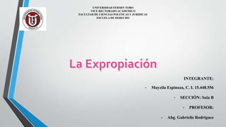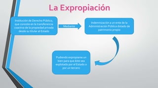 La expropiación es la transferencia forzosa de la propiedad privada al Estado mediante indemnización. Puede realizarse para que el Estado o un tercero exploten un bien. El expropiado tiene derecho a una indemnización equivalente al valor del bien. El proceso de expropiación incluye una declaración de utilidad pública, un decreto de expropiación y un posible juicio si no hay acuerdo. Entre 2006-2016, el Estado venezolano expropió 313 empresas incluyendo telecomunicaciones, cemento, alimentos, acero y