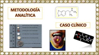 1) El documento presenta información sobre el MDMA (éxtasis), incluyendo su estructura química, efectos, metabolismo y detección en muestras biológicas. 2) Describe el caso de un paciente de 21 años que desarrolló hipertermia y rabdomiólisis asociado al consumo de éxtasis. 3) Los análisis toxicológicos realizados encontraron MDMA y su metabolito MDA, confirmando el diagnóstico de intoxicación aguda por esta sustancia.
