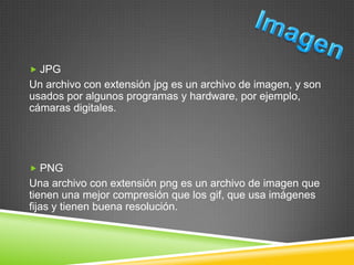 Este documento describe diferentes formatos de archivos de imagen, video y audio, incluyendo sus extensiones de archivo (.jpg, .png, .gif, etc.), sus usos y características principales como la compresión y calidad. Provee información sobre formatos populares como MP3, MP4, JPG y PNG, así como formatos menos comunes.