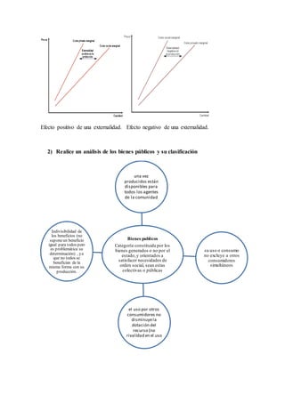 El documento habla sobre las externalidades, bienes públicos y su clasificación. Explica que una externalidad ocurre cuando los costos o beneficios de producir o consumir un bien no son reflejados en su precio, y que pueden ser externidades positivas o negativas. También define los bienes públicos como aquellos que una vez producidos están disponibles para todos y cuyo uso por uno no reduce su disponibilidad para otros, y los clasifica en bienes públicos puros, no puros y locales.