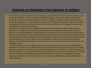 El documento describe las principales causas de extinción de especies animales, incluyendo la caza excesiva, la pérdida de hábitat, las especies invasoras y la contaminación. También explica que el tráfico ilegal de vida silvestre es una de las actividades económicas más lucrativas después del tráfico de armas y drogas, poniendo en peligro cientos de especies animales y vegetales. La acción humana ha aumentado la tasa de extinción mil veces en los últimos 300 años.