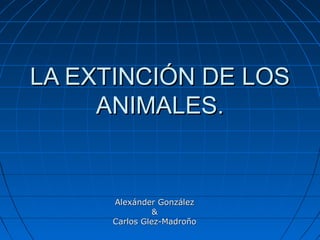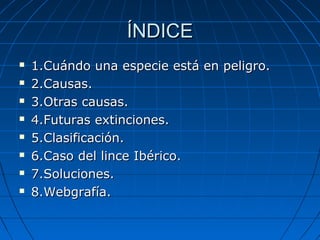 Este documento trata sobre la extinción de animales. Explica que actualmente hay más de 11,000 especies en peligro de extinción debido a factores como la explotación de recursos naturales y el cambio climático. Algunas de las causas principales son la caza, la destrucción del hábitat y la reducción de presas. El documento también analiza el caso crítico del lince ibérico y las soluciones como aumentar la protección, conservar el hábitat y criar especies en cautiverio.