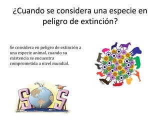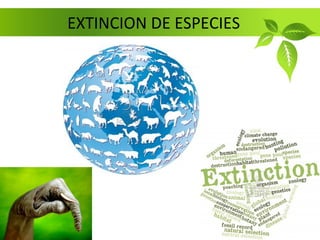 El documento describe las causas y consecuencias de la extinción de especies animales. La principal causa es la acción humana como la contaminación, tráfico ilegal de especies, destrucción de hábitat y cambio climático. Esto ha llevado a que muchas especies como el leopardo de las nieves, albatros y oso polar estén en peligro de desaparecer si no se toman medidas de protección.