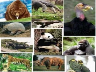 Este documento describe las principales causas de extinción de animales como la contaminación, la explotación de recursos y la caza, y analiza las especies más amenazadas como el oso polar, el tigre de Bengala y el canguro. También resalta la necesidad de tomar conciencia sobre cómo nuestras acciones como seres humanos están llevando a muchas especies al borde de la extinción.