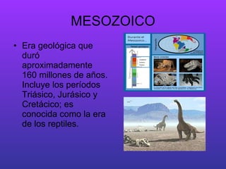 La era Mesozoica (hace entre 250-65 millones de años) se caracterizó por la fragmentación del supercontinente Pangea, la dominación de los reptiles como los dinosaurios y el desarrollo de nuevas especies de plantas y animales. Los continentes se separaron y los océanos actuales empezaron a formarse. El clima era cálido y los dinosaurios colonizaron la tierra junto con las coníferas.