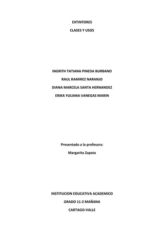 Este documento describe las clases y usos de los extintores. Explica que los extintores contienen un agente extinguidor a presión que se libera a través de una boquilla para apagar el fuego. Luego detalla cuatro clases principales de extintores - Clase A para materiales sólidos, Clase B para líquidos inflamables, Clase C para equipos eléctricos, y Clase D para metales combustibles. El documento también incluye instrucciones sobre cómo usar correctamente un extintor.