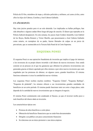 El documento resume el caso de José Cabrera Román, un notario de Machala, Ecuador que operaba un esquema Ponzi desde 1900 hasta su muerte en 2005. Miles de personas perdieron sus ahorros cuando el esquema colapsó tras la muerte de Cabrera. Las autoridades iniciaron investigaciones penales pero nadie fue detenido o condenado. El documento también explica qué es un esquema Ponzi y cómo operan, usando otros casos como ejemplos como Telexfree y TelexFree.