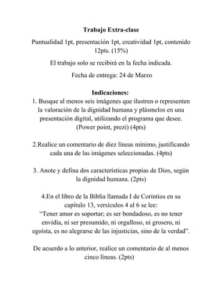 Este documento presenta un trabajo extra-clase sobre la dignidad humana para la clase de Educación Religiosa. Incluye instrucciones para crear una presentación digital con imágenes que ilustren la dignidad humana, un comentario justificando las imágenes, definir características de Dios, y comentar un pasaje bíblico. También contiene secciones sobre igualdad, tolerancia, respeto, amor, perdón, libertad y un comentario final sobre el pasaje.