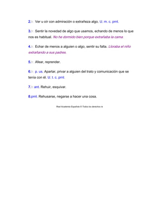 El documento define el significado del verbo "extrañar" en español. Extrañar puede significar desterrar a un país extranjero, ver u oír algo con admiración o extrañeza, sentir la novedad de algo que usamos echando de menos lo habitual, echar de menos a alguien o algo sintiendo su falta, reprender, apartar o privar a alguien del trato, rehuir o esquivar, y rehusarse o negarse a hacer algo.